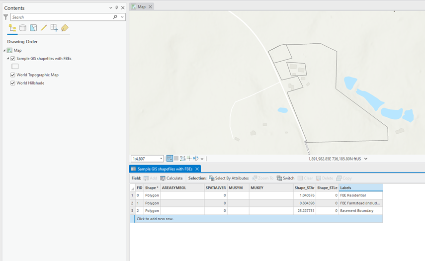 See image to the right for an example of how the shapefile should appear when opened in ArcPro.